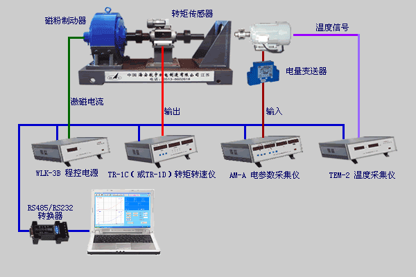 電機測試設(shè)備系統(tǒng)采用磁粉制動器作加載器;采用相位差式轉(zhuǎn)矩轉(zhuǎn)速傳感器進行電機扭矩測試;采用電量變送器進行電機電參數(shù)測試,以完成電壓測量、電流測量、功率因數(shù)測量、功率測量、效率測量、頻率測量;采用數(shù)字溫度傳感器進行溫度測量;根據(jù)用戶要求設(shè)計電機測試軟件,輸出電機測試報告。整個系統(tǒng)是一個電機綜合試驗臺。